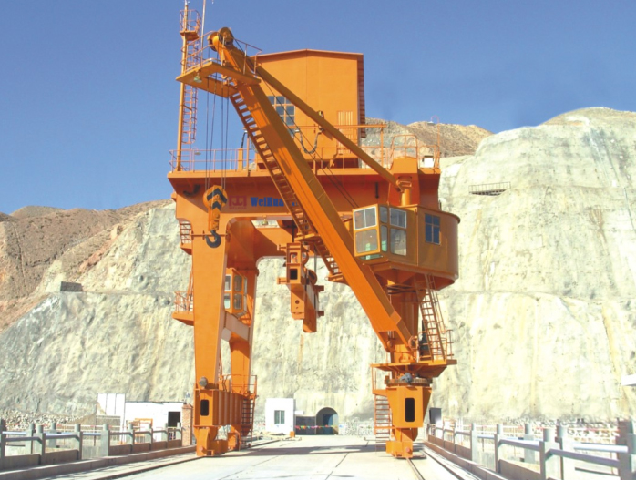 雙向雙回轉(zhuǎn)門機(jī)與雙向門機(jī)類似。大車沿壩體方向運(yùn)動,小車沿水流方向運(yùn)動。一般配有多套抓梁,可對壩上不同中心線上的多孔閘門及攔污柵進(jìn)行啟閉。門機(jī)上游或者下游支腿均配有回轉(zhuǎn)吊,每個回轉(zhuǎn)吊回轉(zhuǎn)半徑可達(dá)180°,可以輔助壩上設(shè)備的運(yùn)輸與安裝。